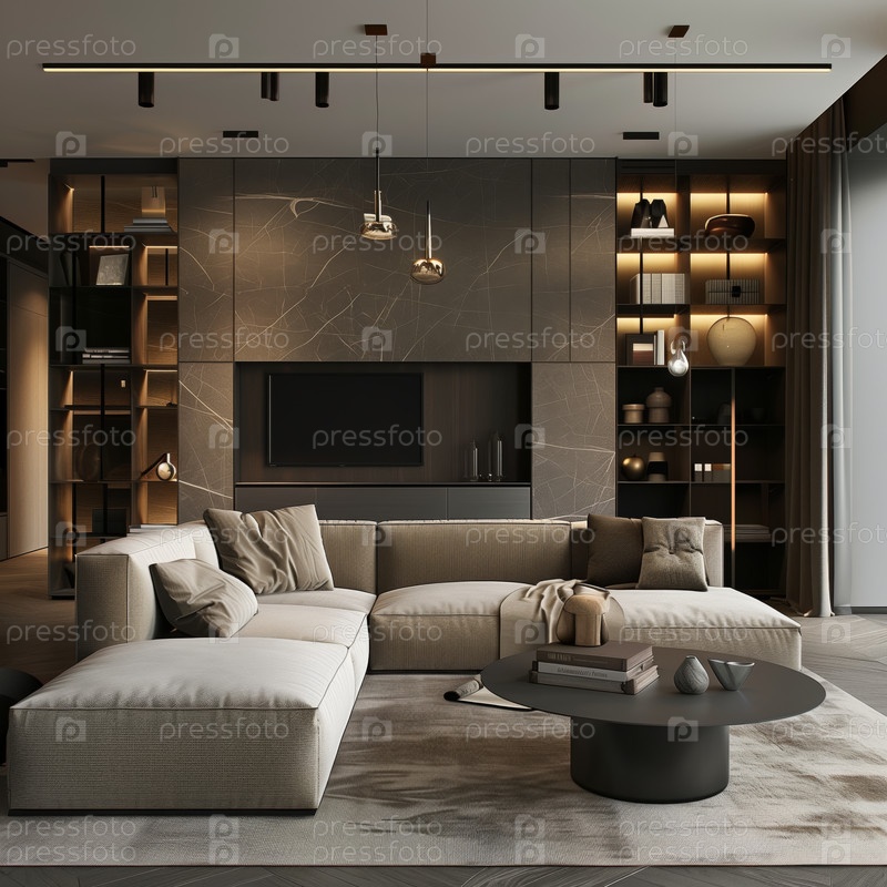 Современный роскошный интерьер гостиной с абстрактным искусством