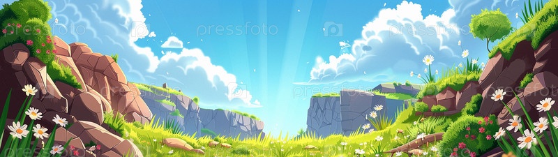 Летняя долина с цветами и деревьями. Панорамный рисунок