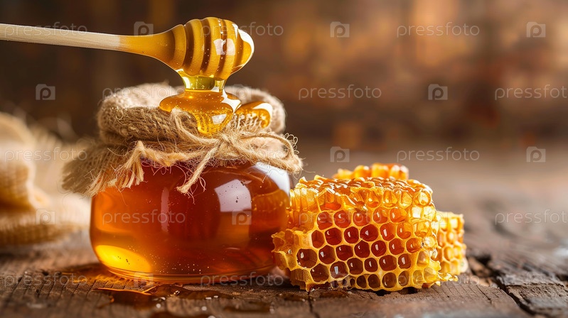 Банка меда с сотами на деревянном столе
