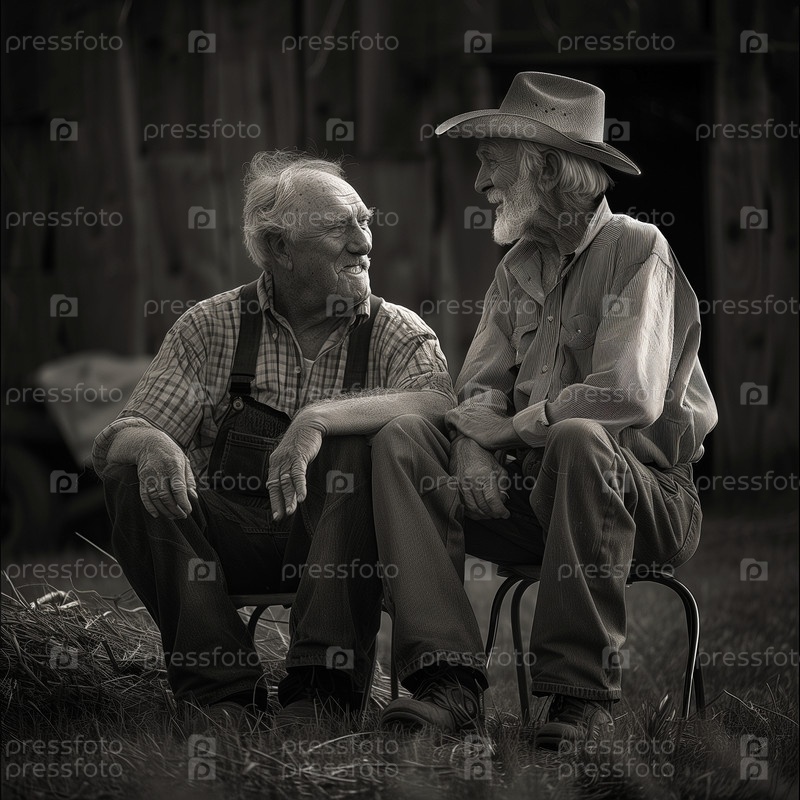 Дружба и командная работа на полях во время посадки и сбора урожая. Дружба между двумя мужчинами. Дружба между двумя детьми. Черно-белое изображение