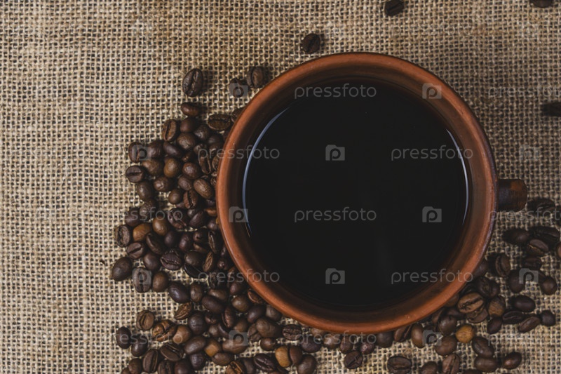 Чашка кофе с зернами на фоне мешковины