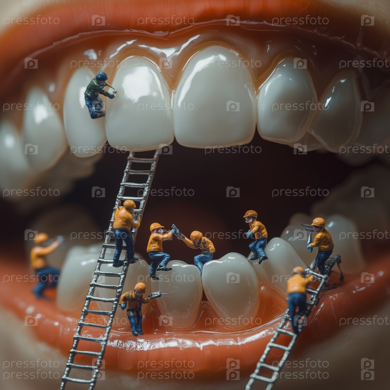 Миниатюрные рабочие чистят гигантские зубы в сюрреалистической концепции