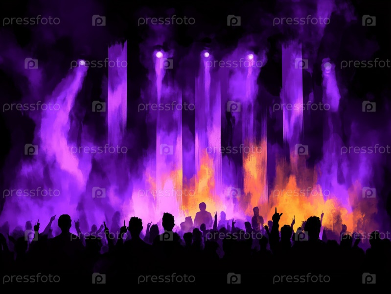 Толпа на концерте с яркой фиолетовой и оранжевой подсветкой