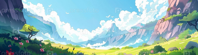 Летняя долина с цветами и деревьями. Панорамный рисунок