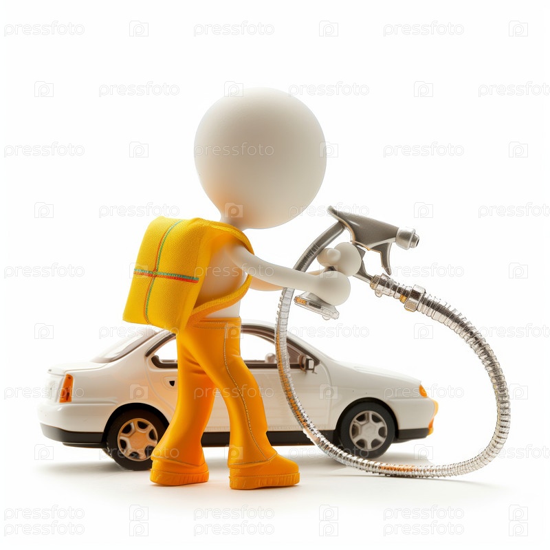 Стикмен моет машину из шланга, изолированный на белом фоне