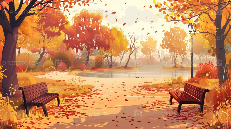 Тихий осенний парк со скамейками и опавшими листьями
