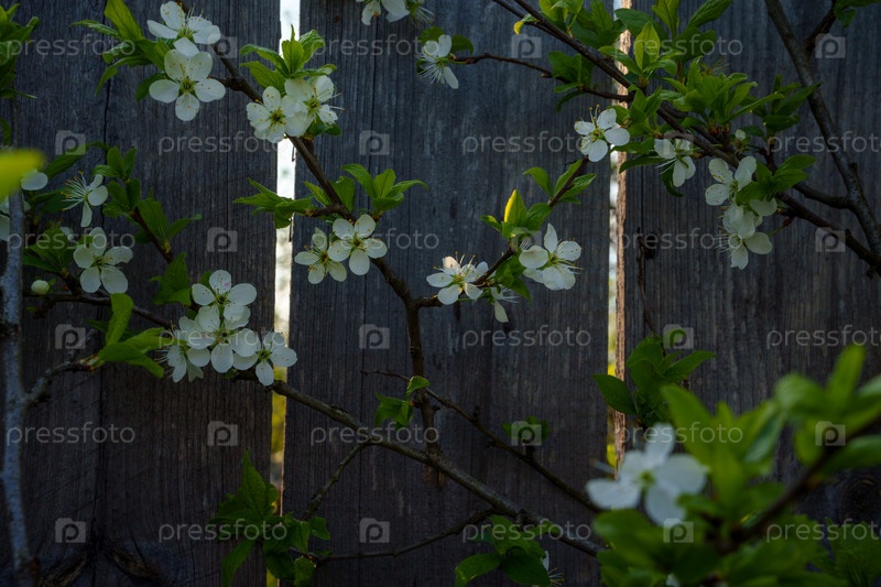 Красивый фон с цветущей вишней на фоне деревянного забора