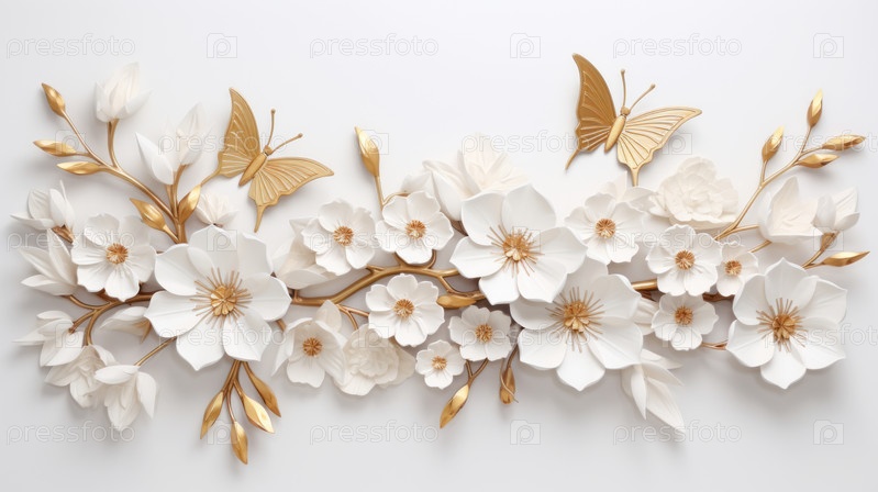 Ветка белого растения с весенними цветами и золотыми бабочками для легкого, светлого фона
