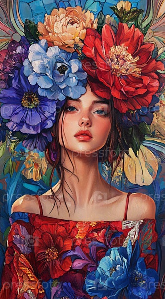 Яркий цветочный головной убор в фэнтезийном портрете, цифровая иллюстрация