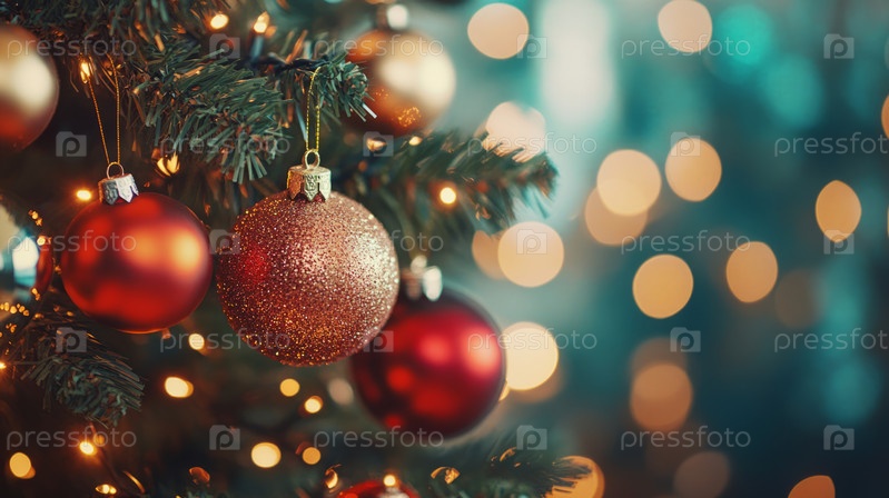 Красиво украшенная рождественская елка с разноцветными игрушками и падающими снежинками создает праздничное и радостное предпраздничное настроение