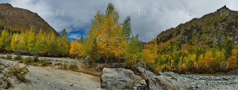 Россия. Кабардино-Балкария. Панорамный вид на горную реку Шхельда в окружении Кавказских гор с ледниками, питающих мутную реку