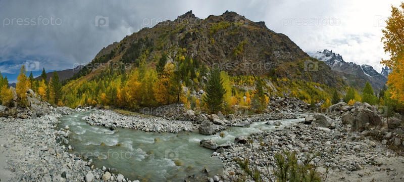 Россия. Кабардино-Балкария. Панорамный вид на горную реку Шхельда в окружении Кавказских гор с ледниками, питающих мутную реку