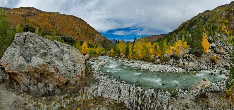 Россия. Кабардино-Балкария. Панорамный вид на горную реку Шхельда в окружении Кавказских гор с ледниками, питающих мутную реку