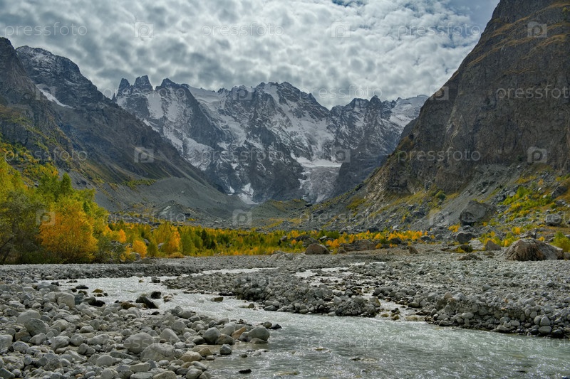 Россия. Кабардино-Балкария. Панорамный вид на горную реку Шхельда в окружении Кавказских гор с ледниками, питающих мутную реку