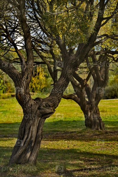 Россия. Московский парк Покровское-Стрешнево. Корявые стволы ивы на берегу озера в осеннем городском парке