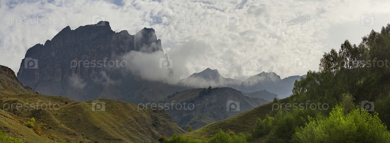 Россия. Приэльбрусье. Высокие горные вершины Северного Кавказа окутаны утренним туманом, парящим на разных уровнях неприступных скал