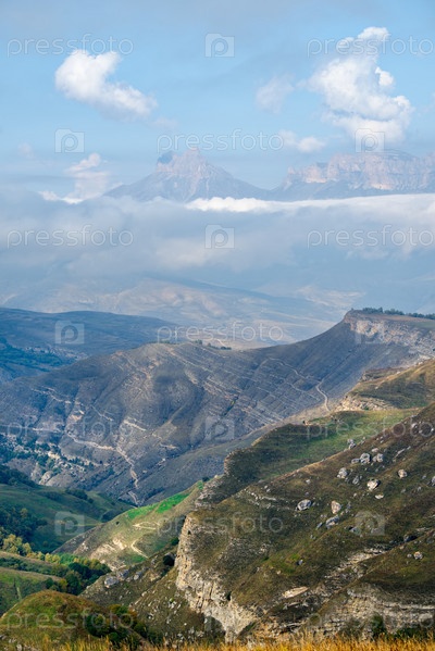 Россия. Приэльбрусье. Высокие горные вершины Северного Кавказа окутаны утренним туманом, парящим на разных уровнях неприступных скал