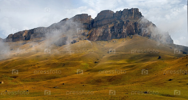 Россия. Приэльбрусье. Высокие горные вершины Северного Кавказа окутаны утренним туманом, парящим на разных уровнях неприступных скал