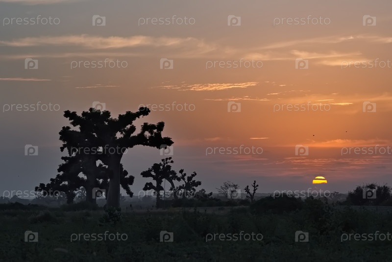 Западная Африка. Сенегал. Живописная контуры грандиозных баобабов на арахисовом поле в лучах заходящего солнца