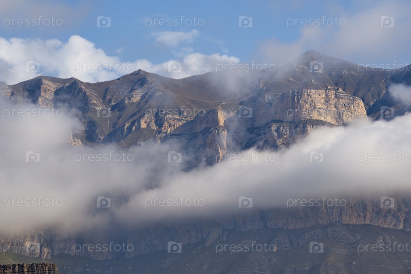 Россия. Приэльбрусье. Высокие горные вершины Северного Кавказа окутаны утренним туманом, парящим на разных уровнях неприступных скал