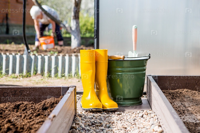 Желтые резиновые сапоги, ведро и маленькая лопатка в новой теплице. Концепция весенней посадки овощей и земледелия