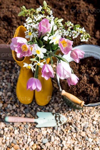 Желтые резиновые сапоги с букетом весенних тюльпанов и нарциссов. Ведро и небольшая лопатка в новой теплице. Концепция весенней посадки овощей и земледелия