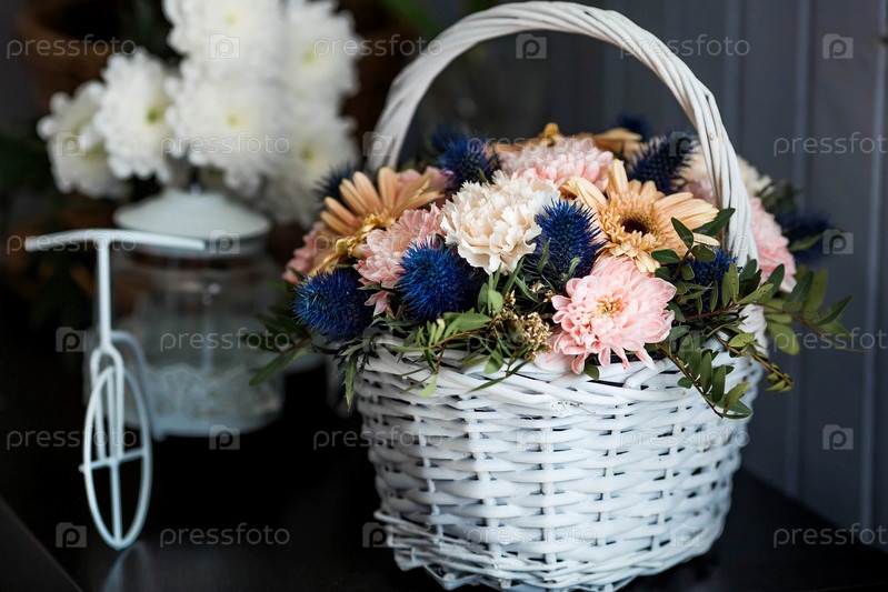 Красивый, нежный букет цветов в белой плетеной корзине в интерьере. Крупный план. Украшение