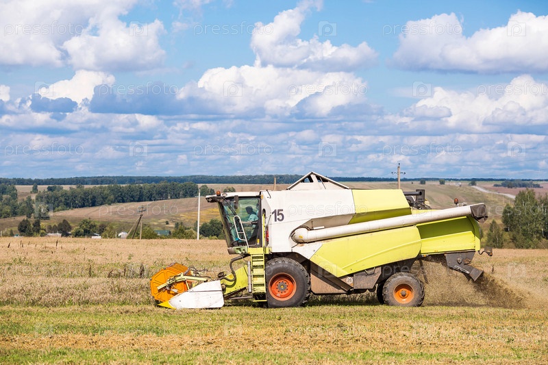 Сельскохозяйственная промышленность. Комбайн убирает урожай с поля. Концепция переработки и сбора. Сельский пейзаж. Сельскохозяйственная техника