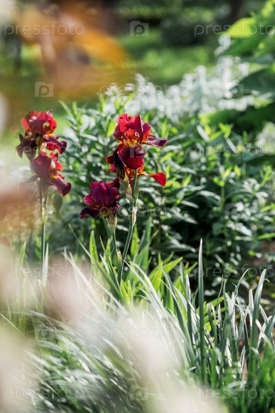Красный, бордовый цветок ириса в цветущем летнем саду. Красивый естественный природный фон