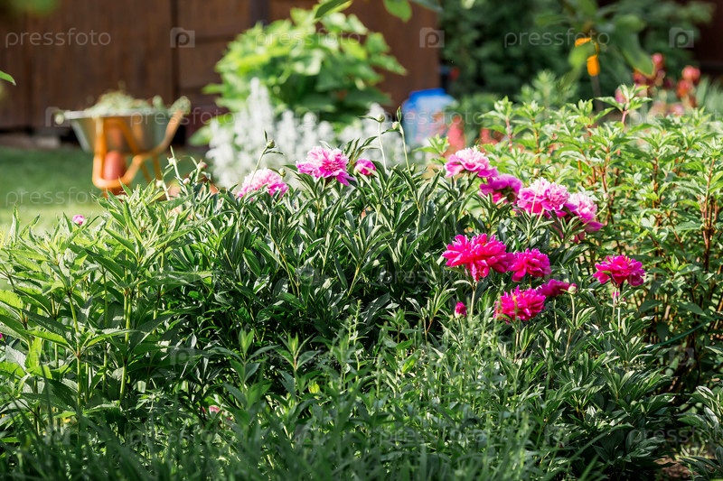 Крупный план цветущих розовых пионов. Цветы и бутоны пионов в весеннем саду. Зеленый естественный фон. Цветущий сад. Красивое боке