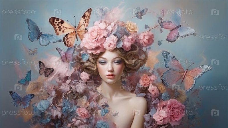 Сгенерированная искусственным интеллектом иллюстрация картины маслом, изображающей женщину среди ярких цветов