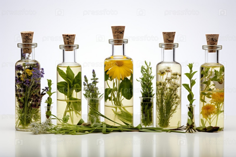 Различные целостные травы в бутылках с маслом в ряд на деревянной доске, светлый фон. Ромашка, календула, базилик травяная ароматерапия