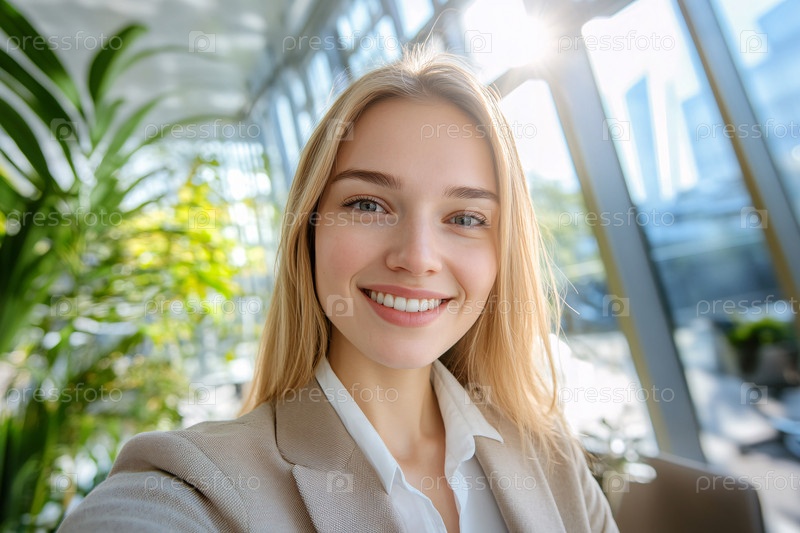 Профессиональное селфи в современном зеленом офисе с солнечным светом и растениями