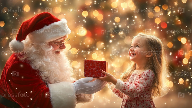 Маленькая девочка получает подарок от Санта-Клауса возле красиво украшенной рождественской елки, олицетворяющей волшебство и радость праздника