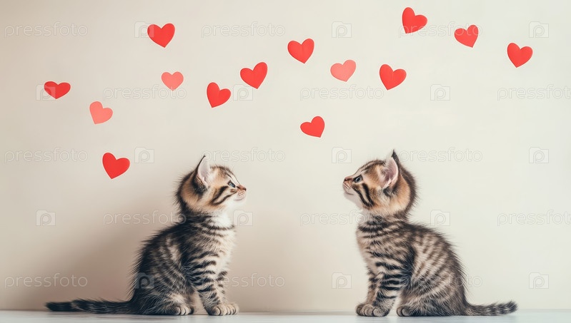 Два пушистых котенка смотрят на висящие сердца, окруженные красными огнями боке, в очаровательной романтической сцене, идеально подходящей для тематики Дня святого Валентина
