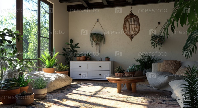 Уютная солнечная гостиная с пышным зеленым декором