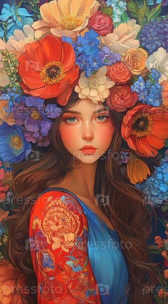 Яркий цветочный головной убор в фэнтезийном портрете, цифровая иллюстрация