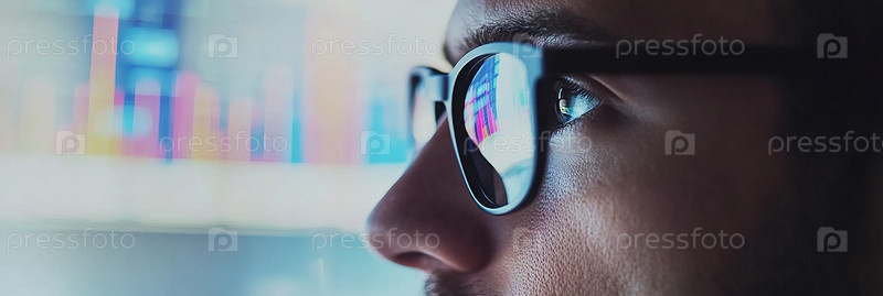 Крупный план глаза в очках, отражающего данные с нескольких экранов, что символизирует аналитический фокус