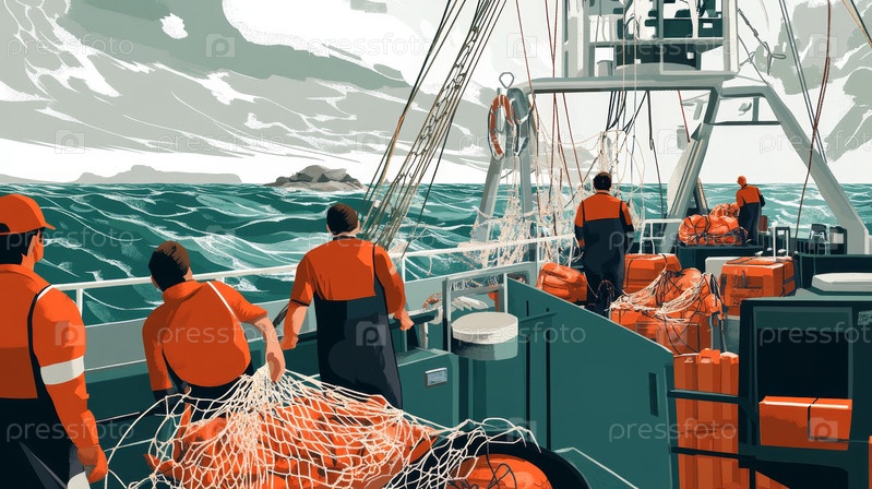 Фотография рыбаков, усердно работающих с сетями на прочном рыболовном траулере под солнечным голубым небом, иллюстрирующая морские традиции