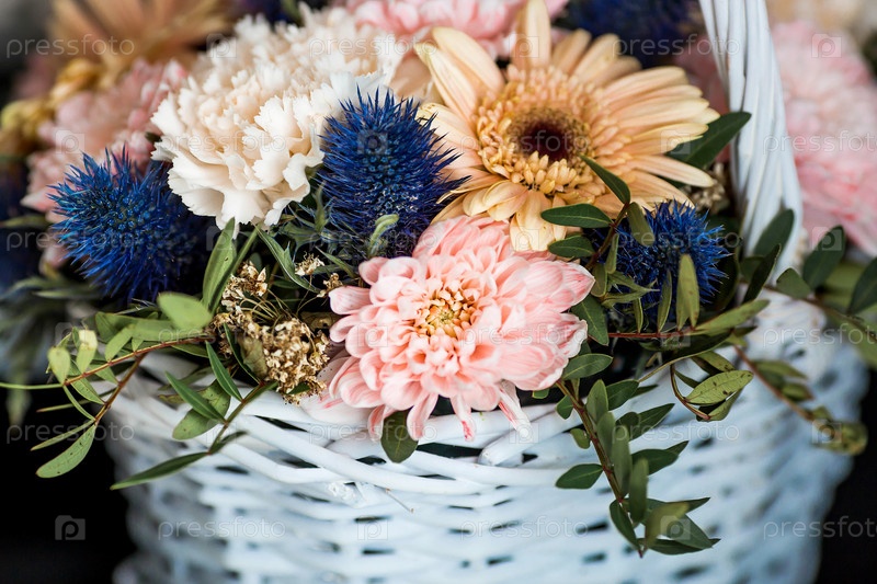 Красивый, нежный букет цветов в белой плетеной корзине в интерьере. Крупный план. Украшение