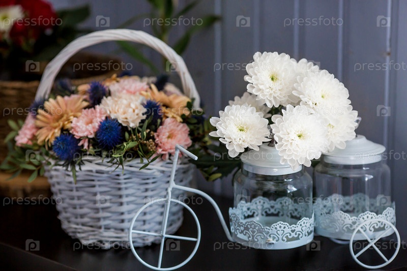 Красивый, нежный букет цветов в белой плетеной корзине в интерьере. Крупный план. Украшение