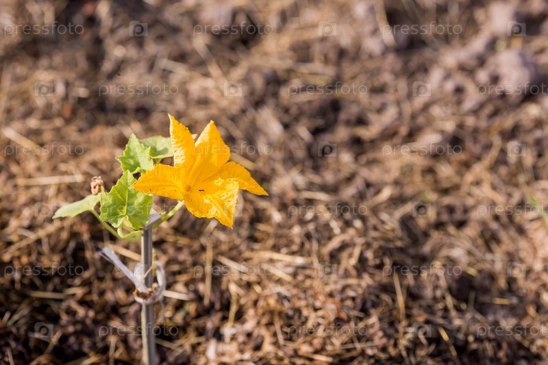 Почва с молодым растением. Высаживаем рассаду тыкв и кабачков в землю. Концепция сельского хозяйства и сбора урожая. Крупный план