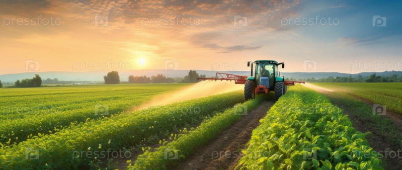 Трактор распыляет пестициды и удобрения на полях соевых бобов