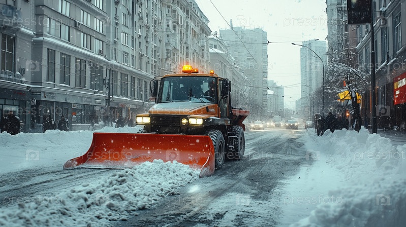 Снегоочиститель расчищает дорогу от снега ярким морозным зимним утром