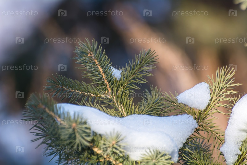 Еловые ветки с иголками под снегом