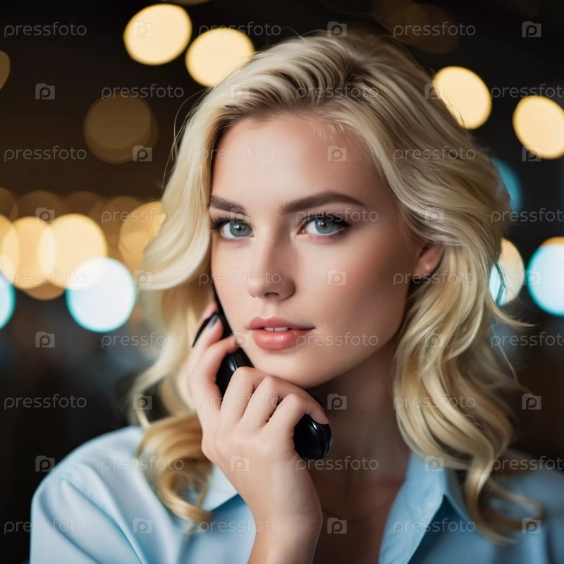 Молодая женщина со светлыми волосами разговаривает по телефону, элегантно одетая, в окружении теплого, сияющего света во время изысканного вечернего мероприятия