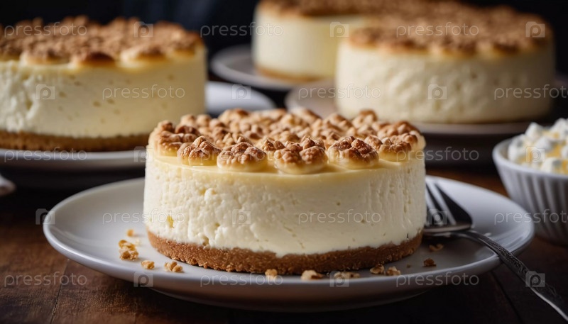 Побалуйте себя крупным планом кремовых творожных чизкейков с хрустящими орехами, элегантно поданных в деревенской кухонной обстановке. Генеративный ИИ