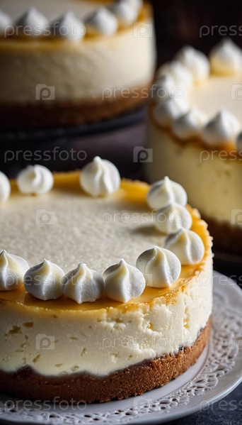 Крупным планом показан восхитительный чизкейк с творогом, красиво украшенный сверху завитком взбитых сливок, подчеркивающим его кремовую текстуру и привлекательный вид. Генеративный ИИ
