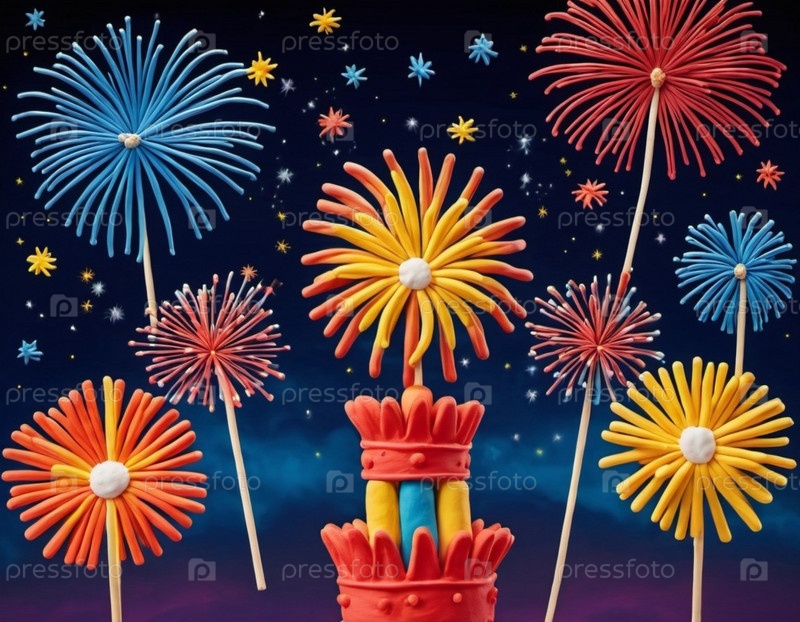 Причудливая ночная сцена с пластилиновым замком, освещенным теплым светом, с красочными фейерверками, взрывающимися над ним. Праздничная и волшебная атмосфера. Создано ИИ. Фейерверки на празднике