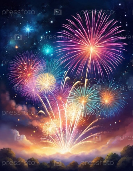 Яркое представление фейерверков освещает ночное небо. Большие вспышки света освещают темный холст выше, создавая завораживающее зрелище цвета и движения. Сгенерировано ИИ. Праздничный фон